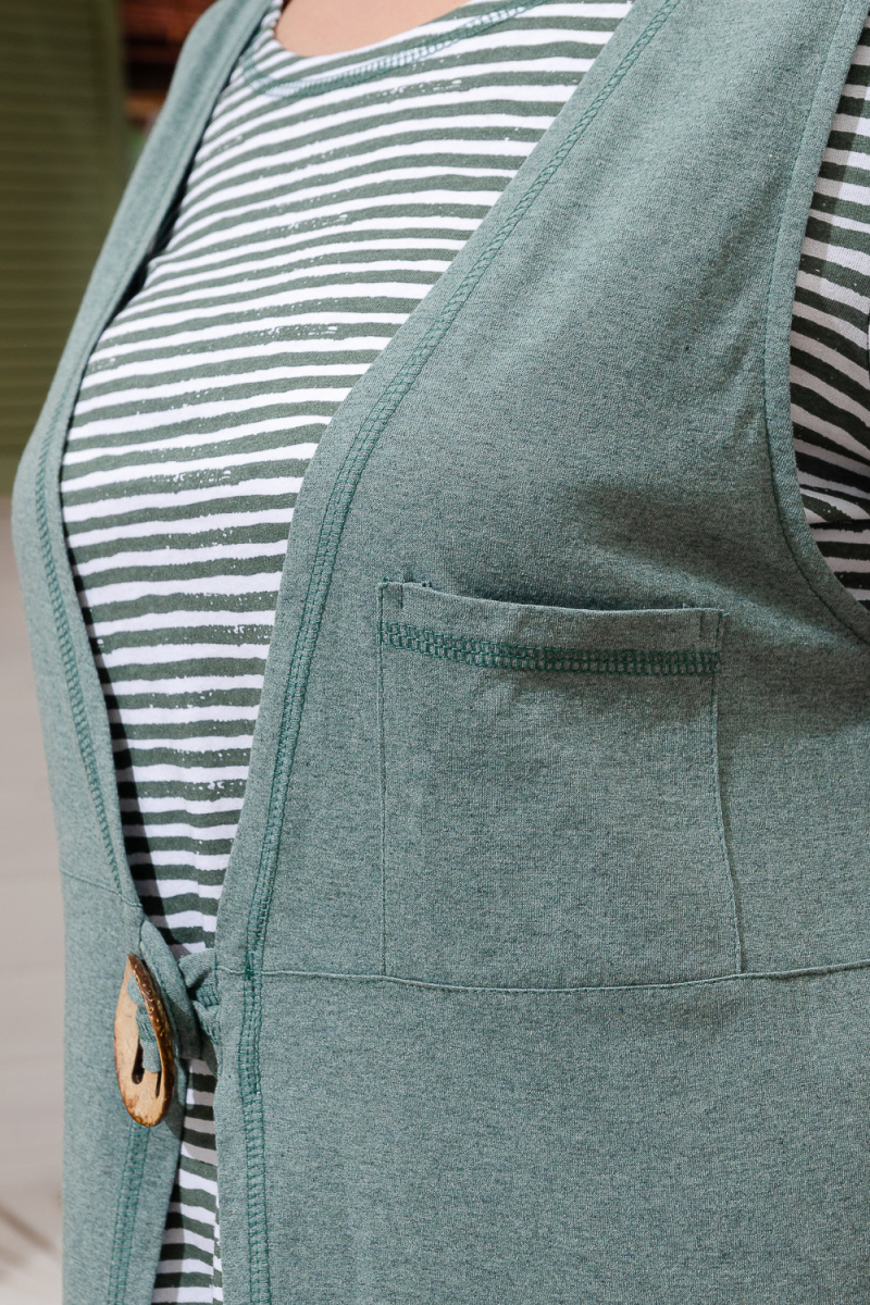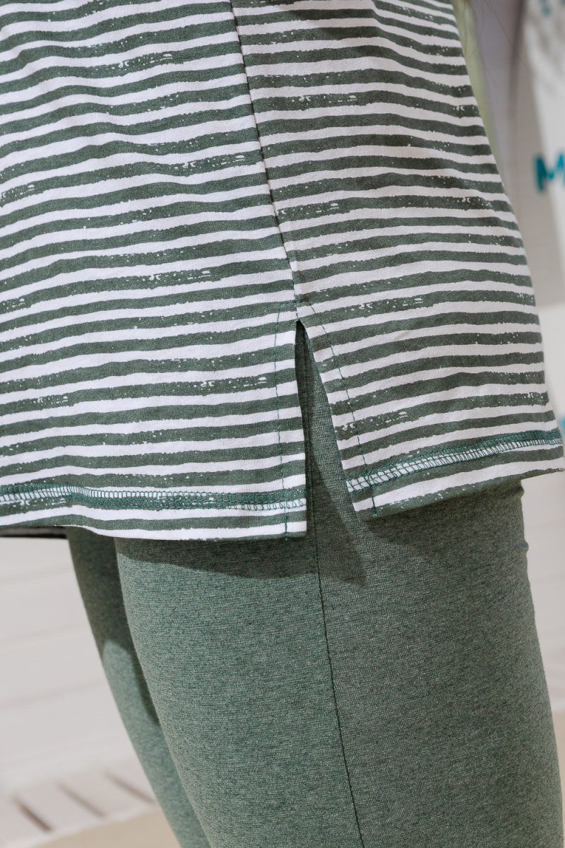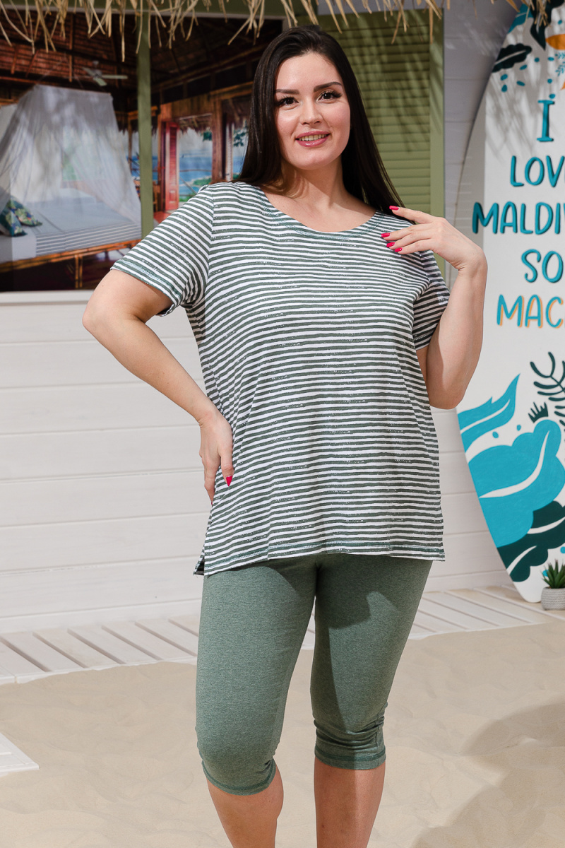 Костюм женский "тройка": Футболка, жилет, бриджи. Футболка с округлым вырезом, короткими рукавами и разрезами в боковых швах. Жилет прямого силуэта. Полочка и спинка из двух частей: верхней и нижней. Застежка на одну декоративную кокосовую пуговицу на уровне линии талии. Бриджи облегающие из х/б ткани с лайкрой.